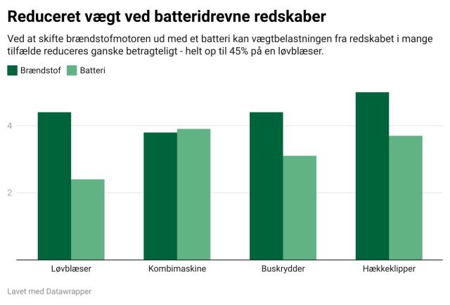 Batteriteknologien er nu om dage så god, at der kan pakkes meget kraft ned i et forholdsvis let batteri. Sammenlignet med de redskaber, der kræver en forbrændingsmotor for at køre, er vægten på de batteridrevne derfor meget lavere til gavn for den enkelte medarbejders ergonomi. Ved længerevarende opgaver kan man anvende rygbatteri, som bæres tæt på kroppen og dermed belaster lænderyggen mindre.