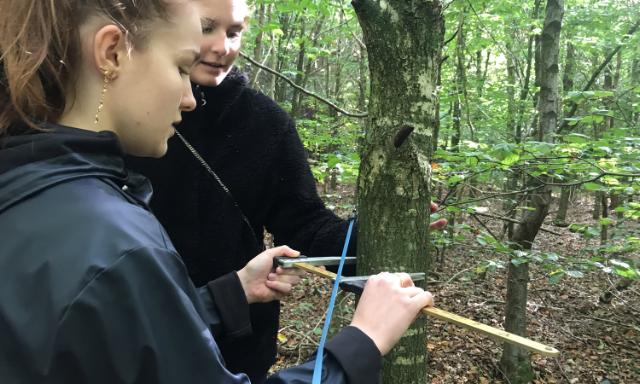 Øvelsen går ud på at tælle træer – levende vel at mærke – inden for en cirkel med en radius på godt fem meter og efterfølgende måle hver stammes diameter. På den måde kan de finde frem til, hvor meget CO2 lige præcis dette skovstykke suger ud af atmosfæren pr. år.